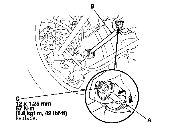 3. Hold the adjusting bolt (A) on the rear control arm (B), and loosen the self-locking nut (C).