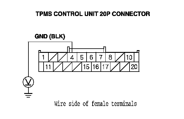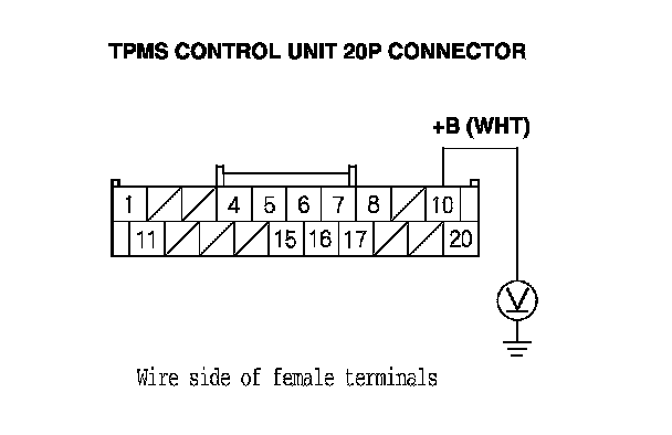 11. Measure the voltage between body ground and TPMS control unit 20P connector terminal No. 10.