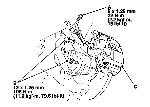 4. Remove the brake caliper bracket mounting bolts (B), then remove the caliper assembly (C) from the knuckle. To prevent damage to the caliper assembly or the brake hose, use a short piece of wire to hang the caliper assembly from the undercarriage. Do not twist the brake hose excessively.