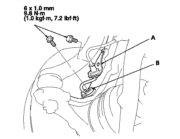 5. Remove the wheel speed sensor harness bracket (A) and the wheel speed sensor (B) from the knuckle. Do not disconnect the wheel speed sensor connector.