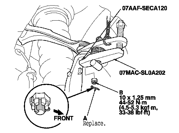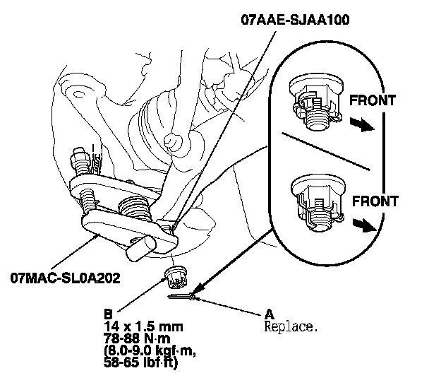 - First install all of the components, and lightly tighten the bolts and the nuts, then raise the suspension to load it with the vehicle's weight before fully tightening to the specified torque. Do not place the jack against the ball joint pin of the knuckle.