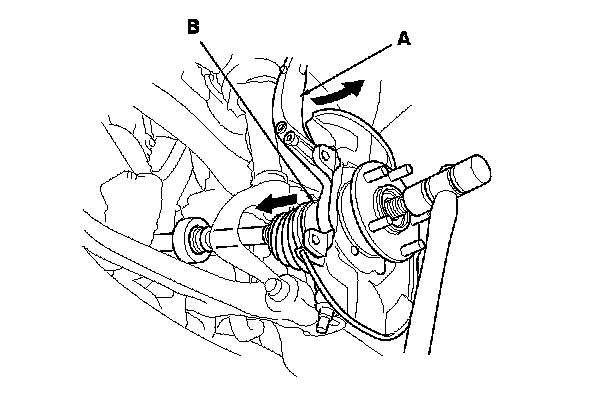 15. Pull the knuckle (A) outward, and separate the outboard joint (B) from the front hub using a plastic hammer.