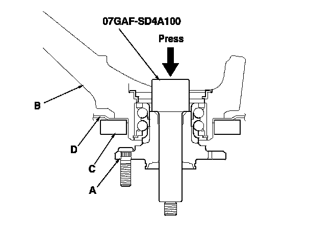 7. Press a new wheel bearing (A) into the knuckle (B) using the old bearing (C), a steel plate (D), the attachment, the support base, and a press.