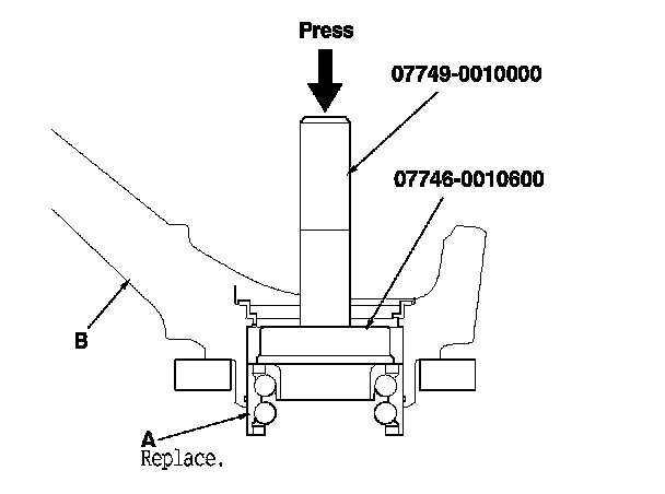 5. Press the wheel bearing (A) out of the knuckle (B) using the attachment, the driver handle, and a press.