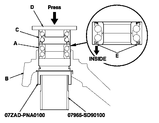 - Install the wheel bearing with the wheel speed sensor magnetic encoder (E) (brown color), toward the inside of the knuckle.