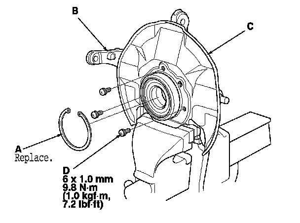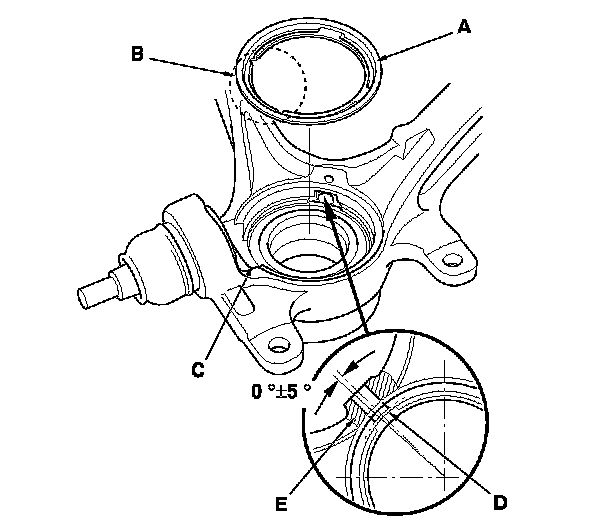 NOTE: When installing the new front knuckle ring, position the knuckle ring notch portion (B) toward the cut out (C) near the ball joint in the knuckle, and align the center of the knuckle ring ledge portion (D) with the center of the wheel speed sensor hole (E) on the knuckle as shown.