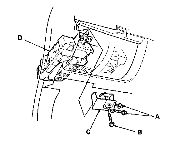 4. Remove the bracket from the driver's under-dash fuse/relay box (D).