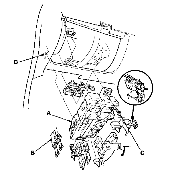 7. Remove the mounting bolt (C), release the tab (D), and pull the driver's under-dash fuse/relay box away from the body.