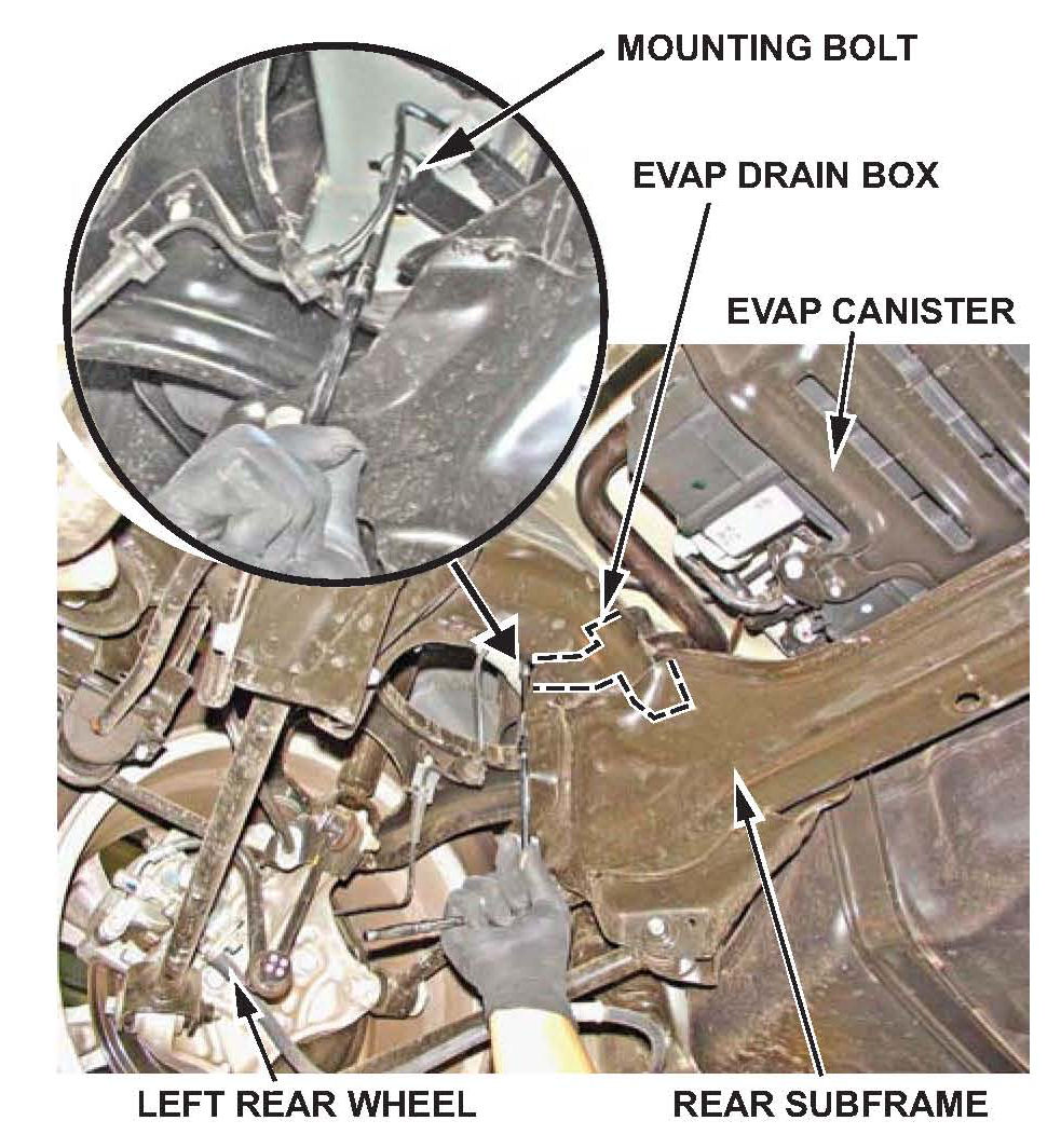 1. Put the vehicle on a lift. Locate the mounting bolt for the EVAP drain box above the driver's side rear subframe, and remove the bolt.