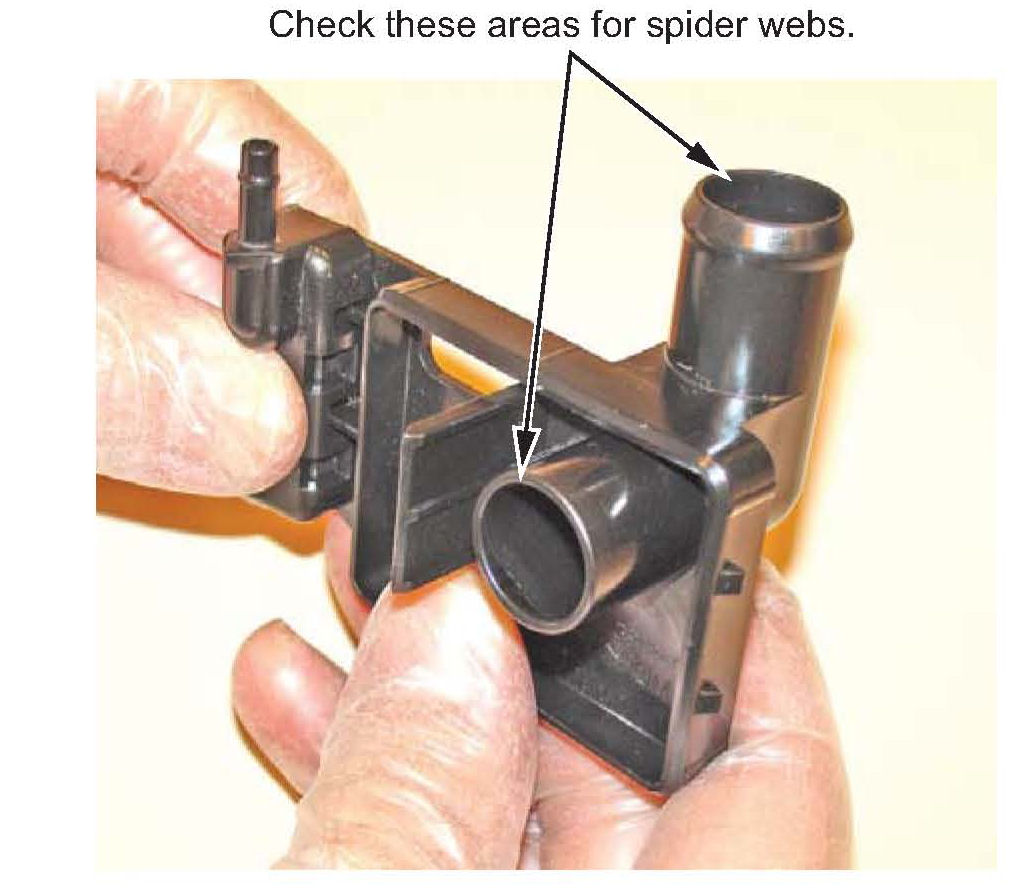 5. Clean the spider webs out of the drain box and the EVAP vent hose with compressed air or a small cleaning brush.