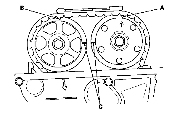 2. Set the No. 1 piston at top dead center (TDC). The punch mark (A) on the variable valve timing control (VTC) actuator and the punch mark (B) on the exhaust camshaft sprocket should be at the top. Align the TDC marks (C) on the VTC actuator and the exhaust camshaft sprocket.