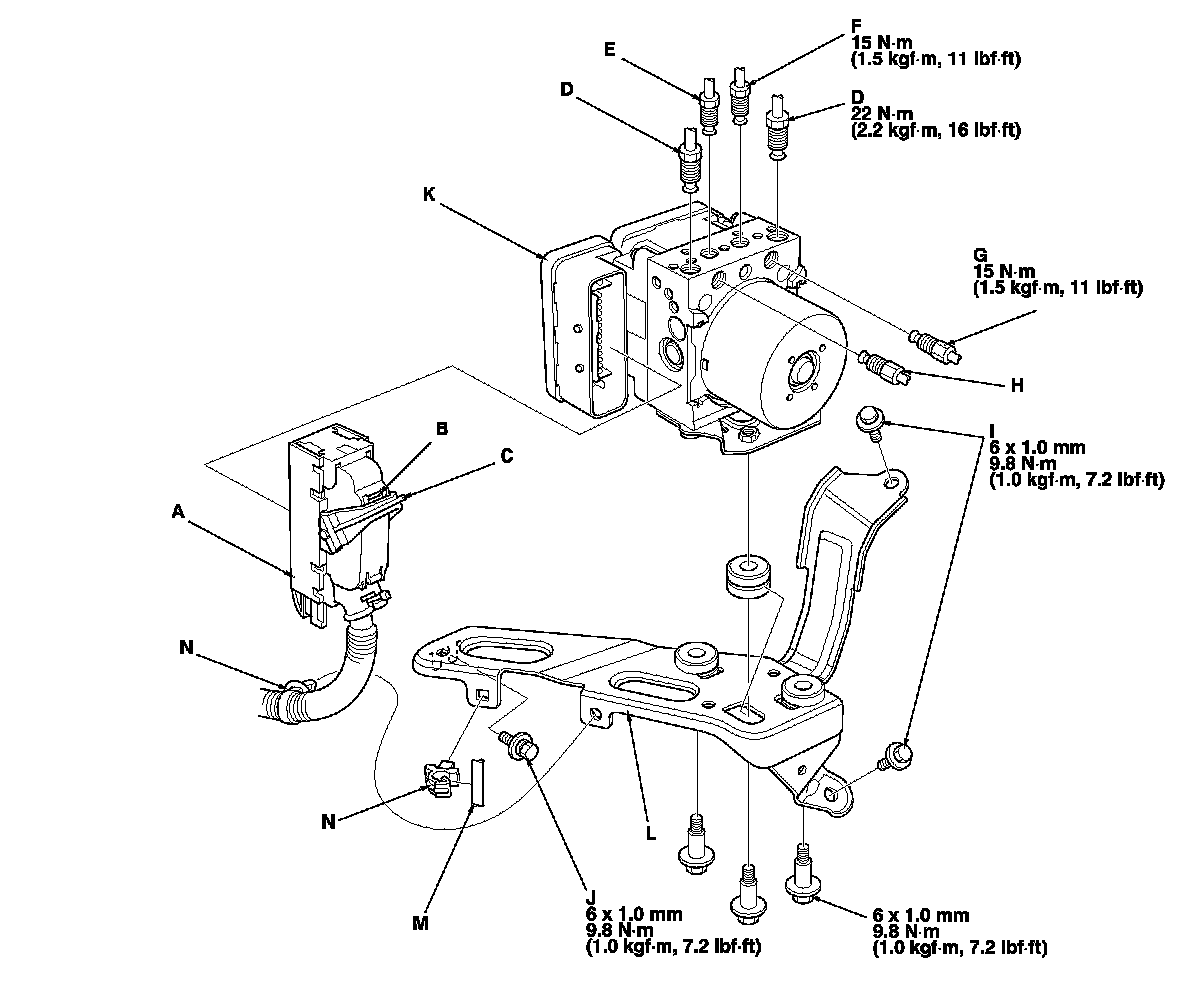 6. Remove the 6 x 12 mm flange bolts (I) and 6 x 16 mm flange bolt (J), then remove the VSA modulator-control unit (K) with the bracket (L) from the body.