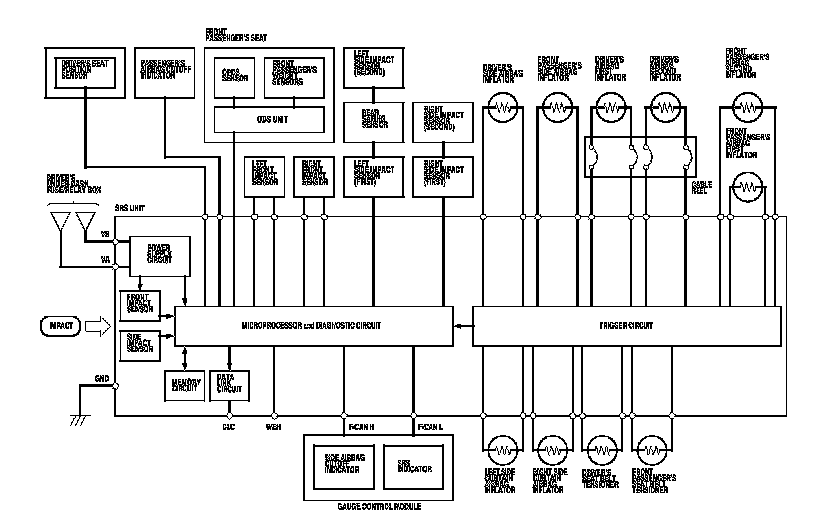 The main circuit in the SRS unit senses and analyzes the force of impact and, if necessary, ignites the inflator charges. If battery voltage is too low or power is disconnected due to the impact, the voltage regulator and the back-up power circuit will keep voltage at a constant level.