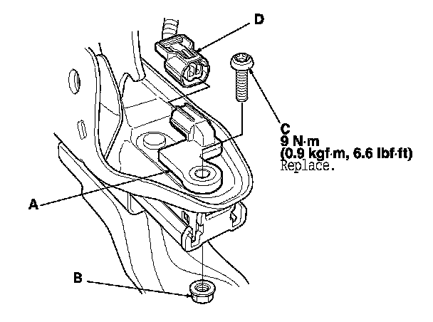 7. Remove the TORX bolt (C) and nut (D) using a TORX T30 bit, then remove the driver's seat position sensor.