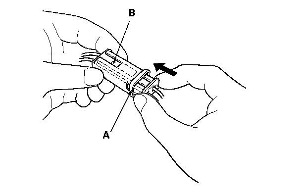 To reconnect, hold the pawl-side connector, and press on the back of the sleeve-side connector in the direction shown. As the two connector halves are pressed together, the sleeve (A) is pushed back by the pawl (B). Do not touch the sleeve.