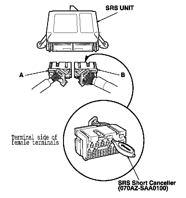 When SRS unit connector A (39P) or B (39P) is disconnected, a short circuit is created in the connector to prevent accidental deployment of an airbag or tensioner. The circuit may need to be opened when diagnosis is done on the system. Insert a SRS short canceller (070AZ-SAA0100) in the specified cavities when it is necessary to keep the circuit open for diagnosis.