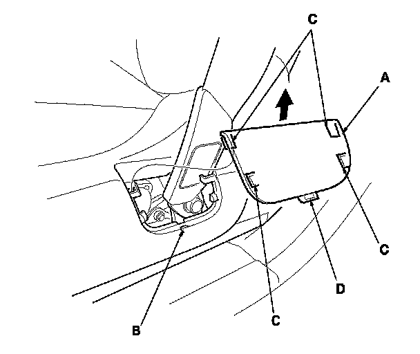 1. Slide the front seat all the way forward. Carefully pry up on the bottom of the anchor cover (A) at the pry point (B) with the appropriate trim tool to release the hooks (C) and the tab (D), then remove the cover by pulling it upward.