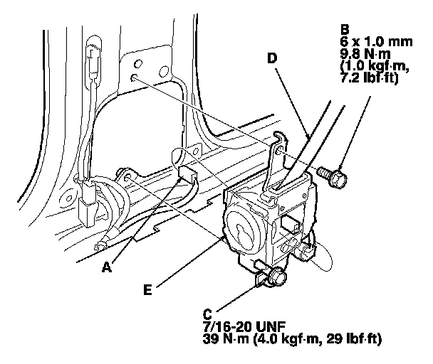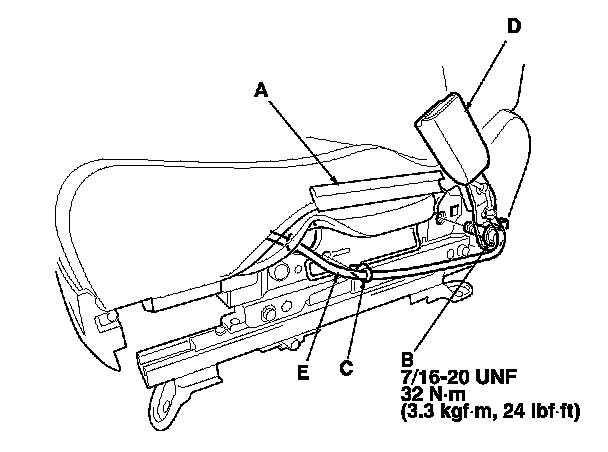 6. Disconnect the seat belt tensioner connector (A). Remove the upper retractor mounting bolt (B) and the lower retractor bolt (C), then remove the front seat belt (D) and the retractor (E).