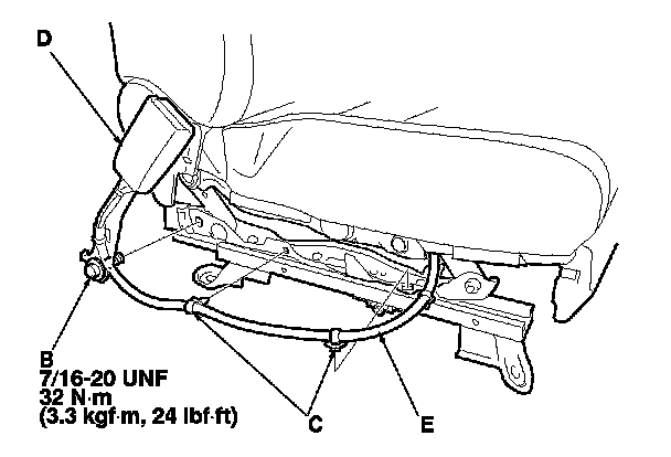5. Pull the seat belt buckle switch harness (E) out through the space between the seat cushion and the seat track (driver's seat), or through the hole in the seat track (passenger's seat).