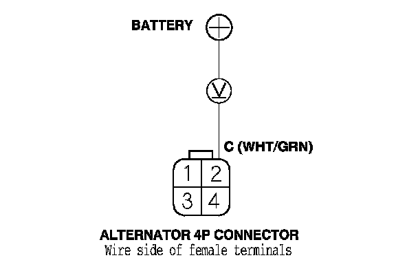 7. Measure the voltage between alternator 4P connector terminal No. 2 and the positive terminal of the battery.