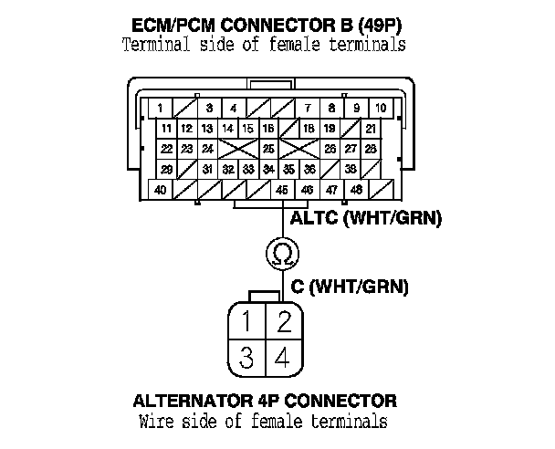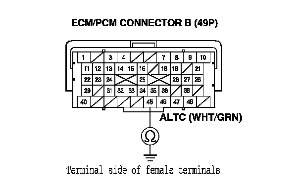 13. Check for loose terminals and connectors, then check for continuity between ECM/PCM connector terminal B45 and alternator 4P connector terminal No. 2.