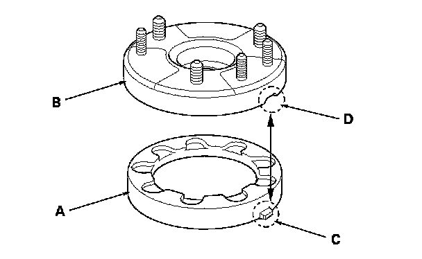 1. Install the spring mounting cushion (A) on the damper mounting base (B) by aligning the tab (C) and notch (D).
