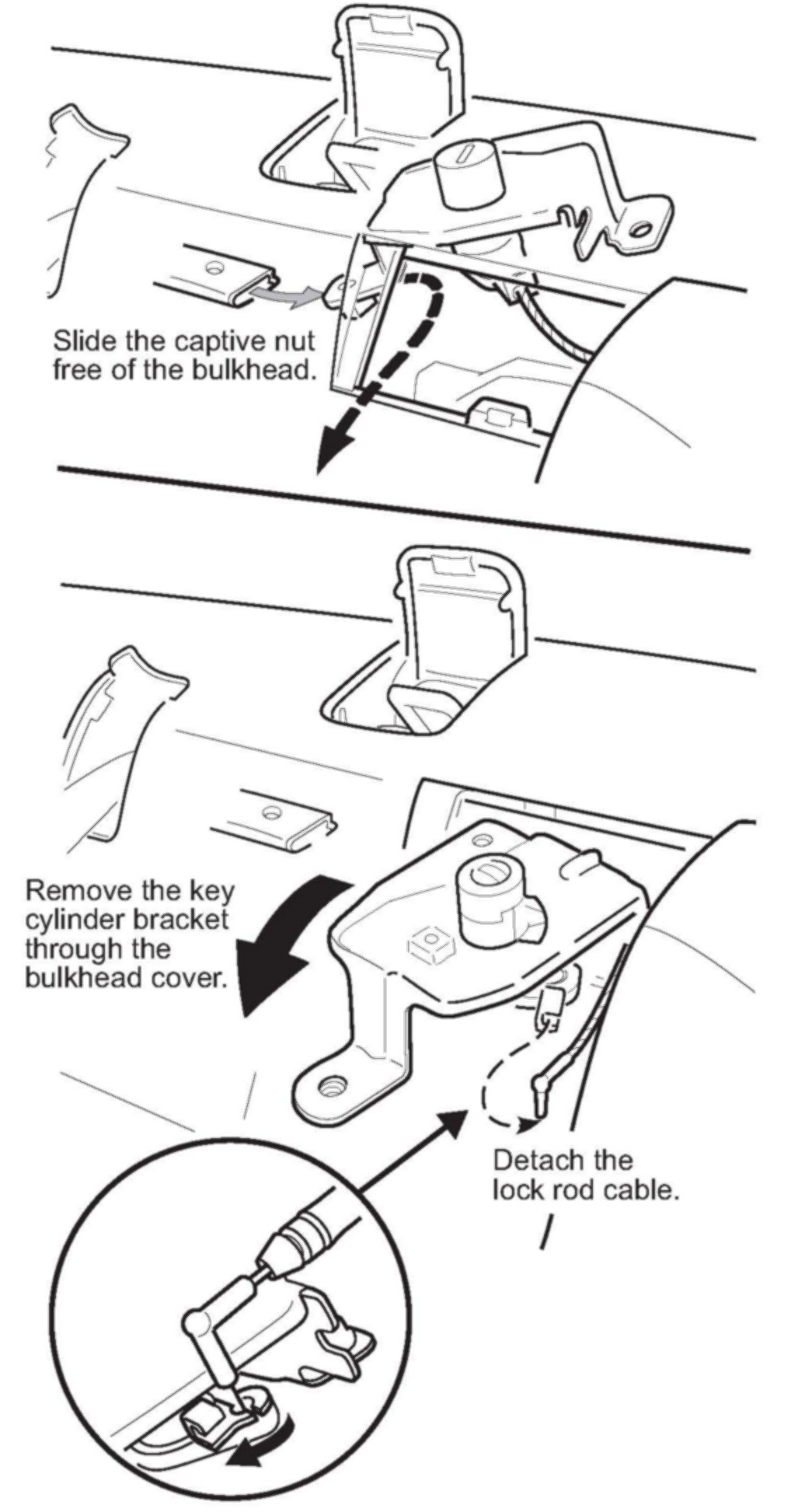 11. Carefully flex the bulkhead cover up and toward you, enough to free the key cylinder bracket's captive nut from the bulkhead, then remove the key cylinder bracket through the bulkhead's left cover opening.