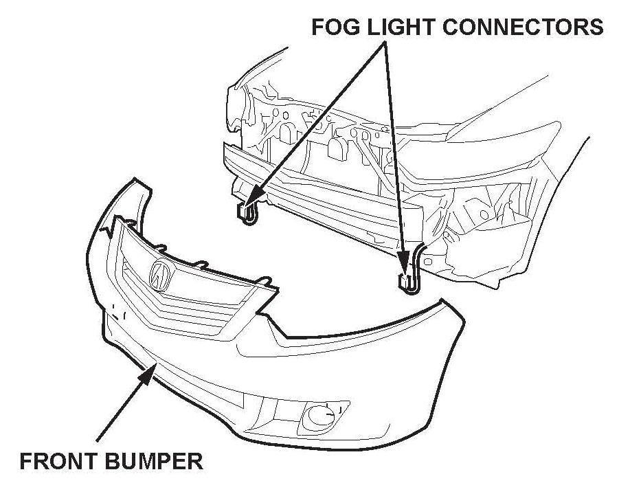 12. Reconnect the fog light connectors, and reattach the bumper to the vehicle. Make sure the bumper engages the hooks of both the upper beam and the side spacers securely on each side.