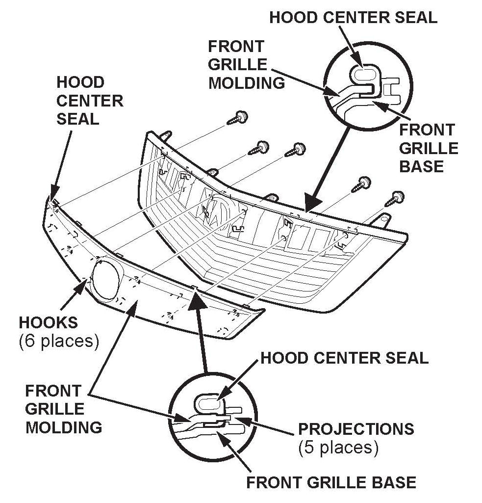 8. Remove the front grille molding by removing the screws, releasing the hooks (six places) from the grille base, and releasing the projections (five places) from the hood center seal.
