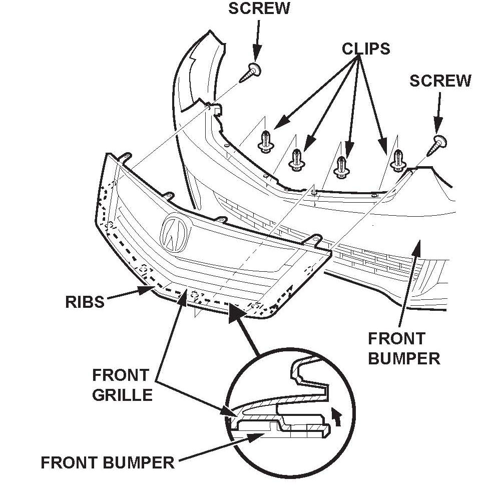 6. Remove the grille by removing the screws, detaching the clips, and releasing the hooks and ribs from the bumper.