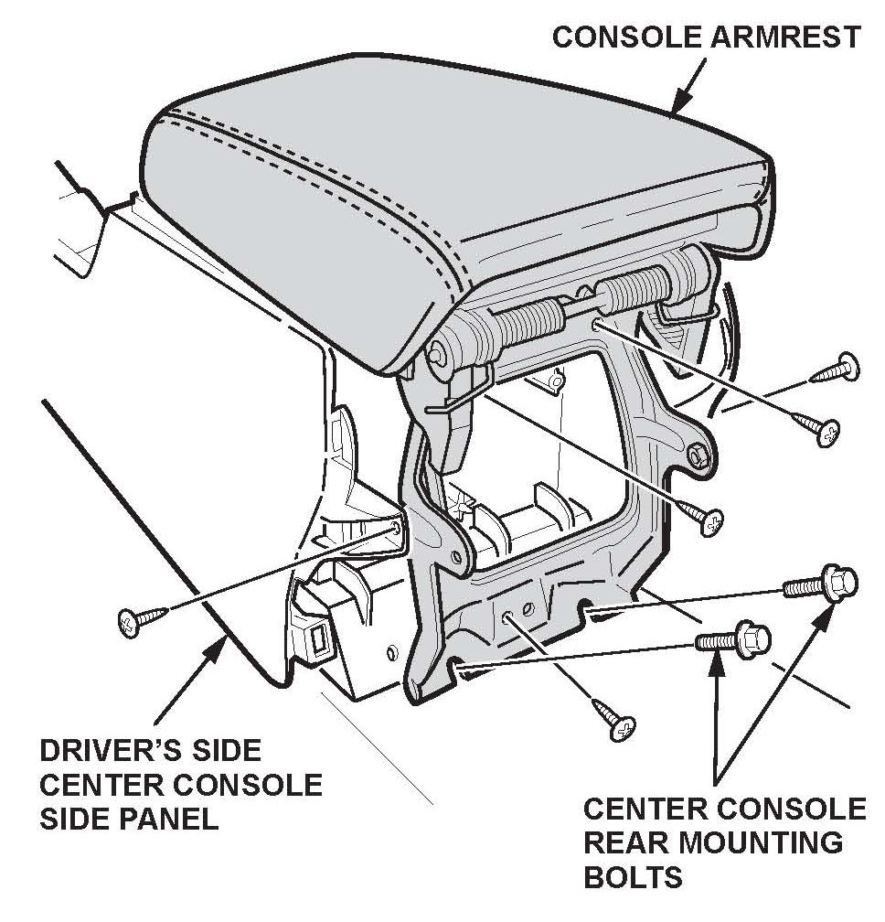 5. Remove the three rear mounting screws securing the console armrest, then remove the armrest to the rear of the console.
