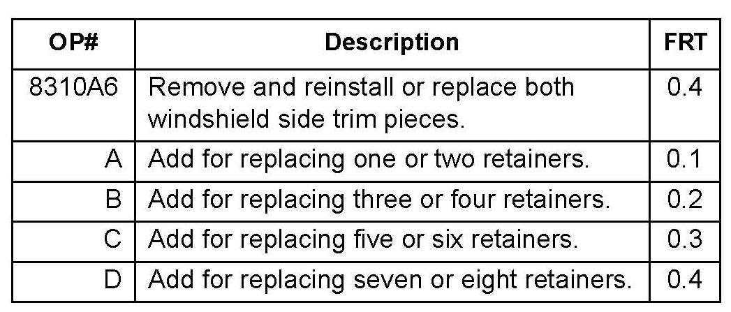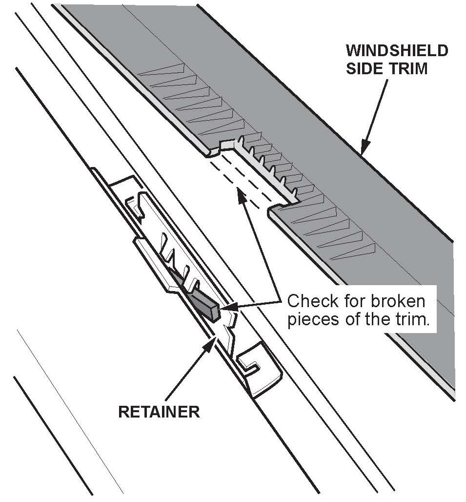 ^ If the bottom clip retainer tabs are broken or stress-whitened, discard the trim and use a new windshield side trim to complete the repair, then go to step 9.