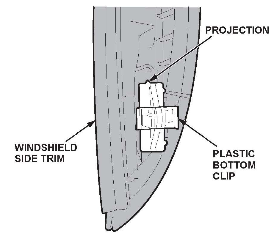 7. Reinstall the plastic bottom clip into the windshield side trim. Make sure the projection on the clip points up.
