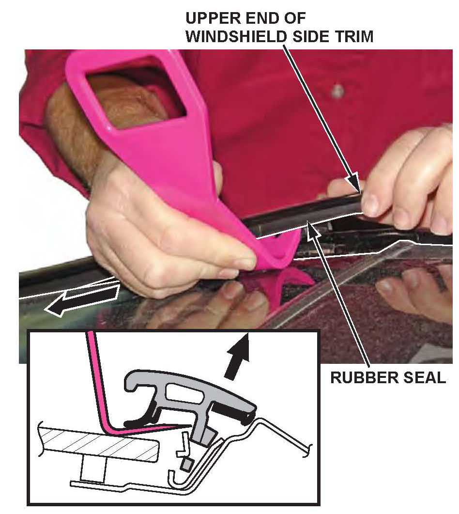 Make sure you do not damage the rubber seal on the windshield side trim.