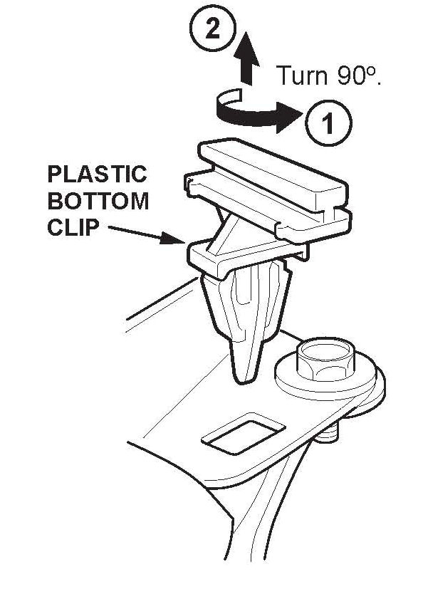 6. Remove the plastic bottom clip on the vehicle by turning it 90 degrees. If the bottom clip is damaged or stress-whitened, replace it.
