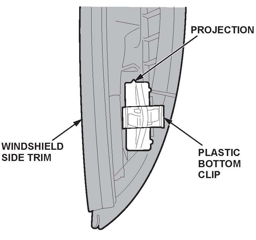 7. Reinstall the plastic bottom clip onto the windshield side trim. Make sure the projection on the clip points up.