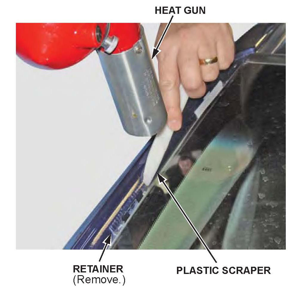 ^ While applying heat, use the plastic scraper to remove any double-sided tape that may be stuck to the A-pillar.