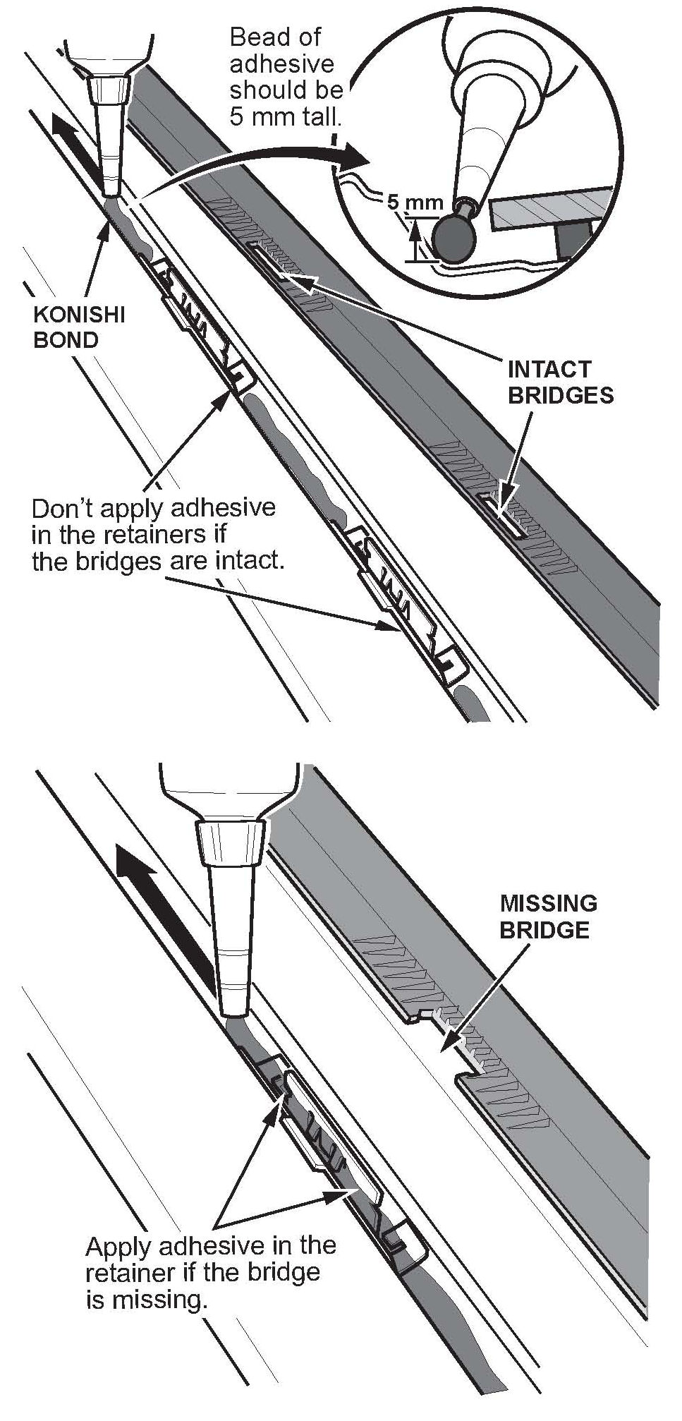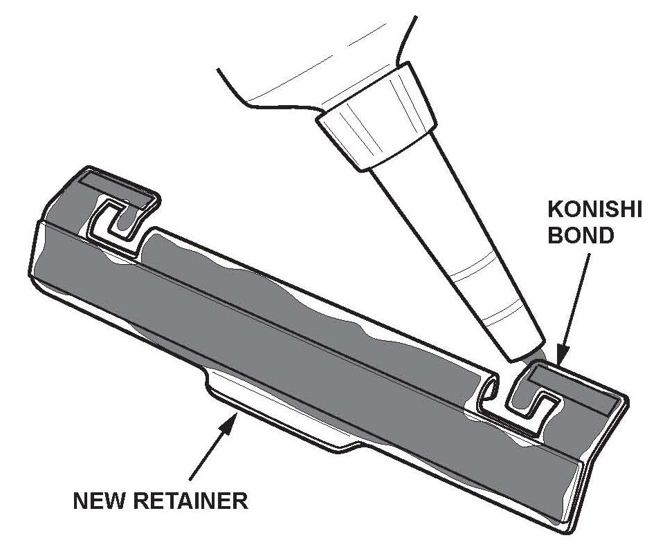 Do not apply Konishi Bond into any retainer where the bridge is still intact on the windshield side trim.