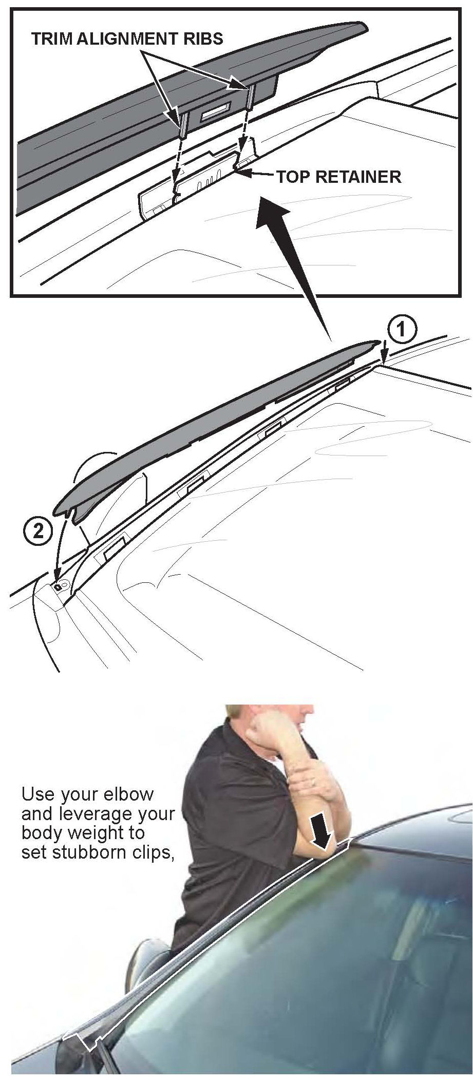 18. Starting at the top, position the windshield side trim to align the top retainer between the trim alignment ribs. Firmly press the trim into the retainers and bottom clip hole until they click into place.