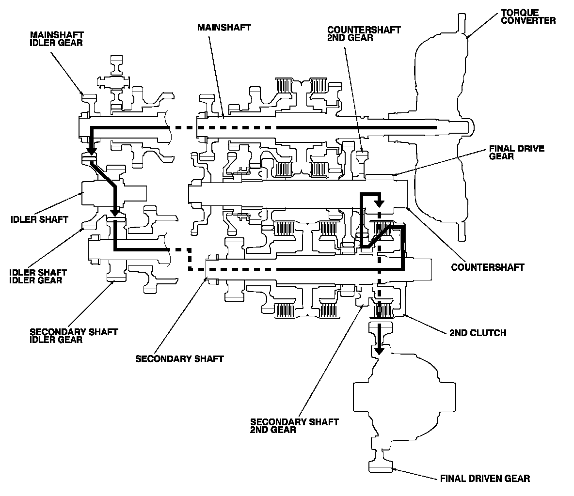 - Hydraulic pressure is applied to the 2nd clutch, then the 2nd clutch engages the secondary shaft 2nd gear with the secondary shaft.