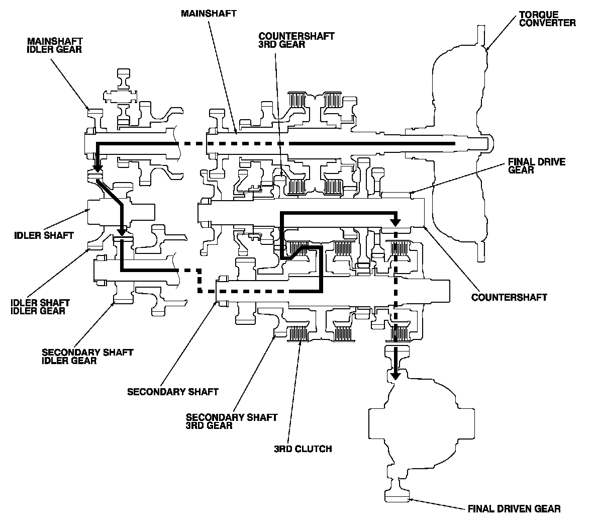 - Hydraulic pressure is applied to the 3rd clutch, then the 3rd clutch engages the secondary shaft 3rd gear with the secondary shaft.