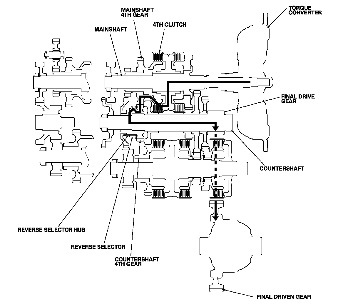 - Hydraulic pressure is also applied to the 4th clutch, then the 4th clutch engages the mainshaft reverse gear with the mainshaft.