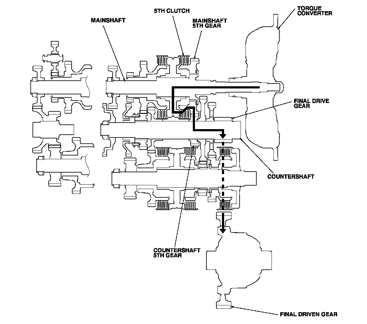 - Hydraulic pressure is applied to the 5th clutch, then the 5th clutch engages the mainshaft 5th gear with the mainshaft.
