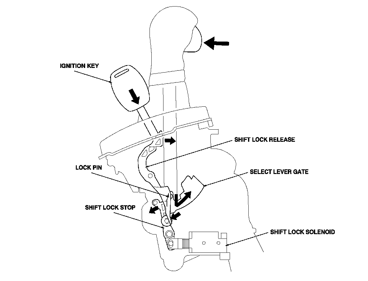 The shift lock system prevents the shift lever from mis-shifting. The shift lock solenoid is normally OFF. After starting the engine in P, the shift lever cannot move to any other position from P because the shift lock stop stops the lock pin unless certain conditions are met. When the brake pedal is pressed and the accelerator pedal is not pressed, the PCM commands the shift lock solenoid ON; the shift lock solenoid plunger in the shift lock solenoid pulls the shift lock stop to release the lock pin. Pressing the shift lever button allows the shift lever to move to any other position. When the brake pedal and the accelerator pedal are pressed at the same time, the PCM commands the solenoid OFF and the shift lock system is locked.