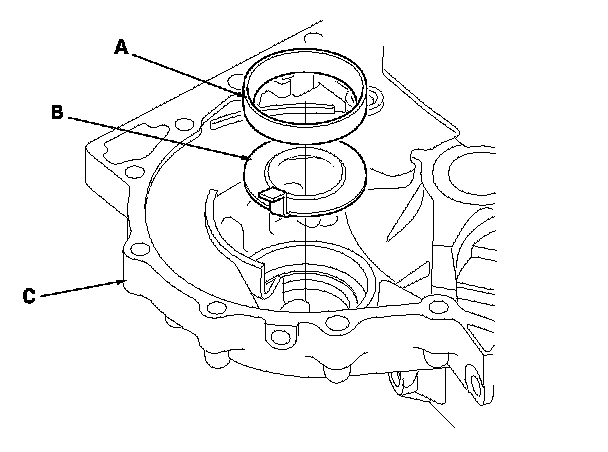 2. Remove the bearing outer race (A) and the 80 mm thrust washer (B) from the torque converter housing (C).
