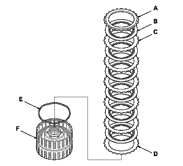 2. Remove the clutch end-plate (A), the clutch discs (B) (5), the clutch wave-plates (C) (4), the clutch flat-plate (D), and the waved spring (E) from the 1st clutch drum (F).