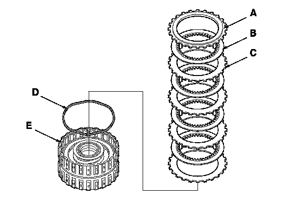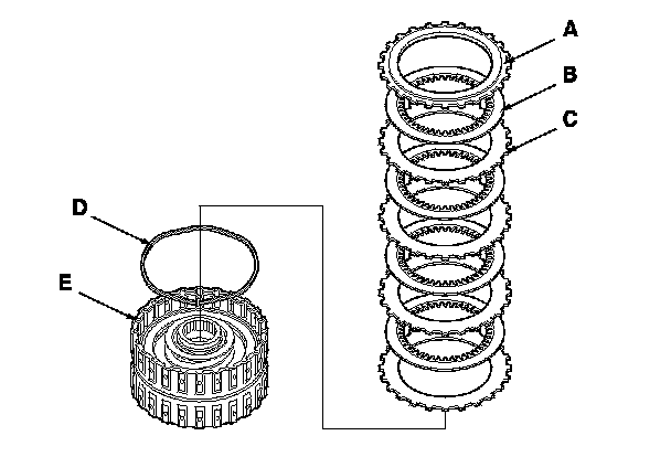 8. Remove the clutch end-plate (A), the clutch discs (B) (4), the clutch wave-plates (C) (4), and the waved spring (D) from the 4th clutch drum (E).