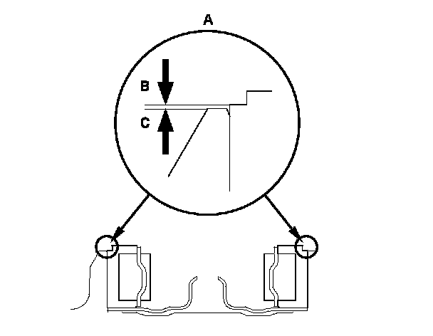 5. Make sure that the bearing outer race notch-cut (A) is installed at a height of 0-0.05 mm (0-0.002 in) (B) above the torque converter housing surface (C). Do not install the countershaft bearing higher than 0.05 mm (0.002 in) above the torque converter housing surface.