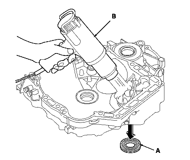 4. Install new O-rings (A) on the ATF guide collar (B), then install the ATF guide collar in the torque converter housing.