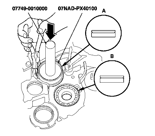 2. Expand each snap ring using snap ring pliers, and install the mainshaft bearing (A) and the countershaft bearing (B) part-way into the transmission housing using the driver handle and the 78 x 80 mm attachment.